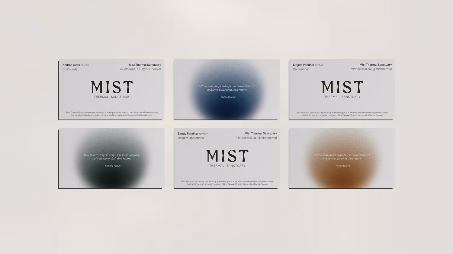 In a wellness landscape cluttered with performative self-care and Instagram-ready experiences, Mist needed to feel genuine and elemental. The identity draws from the atmospheric mist that moves through British Columbia's forests and coastline, and from the four elements themselves: fire, water, earth, and air.