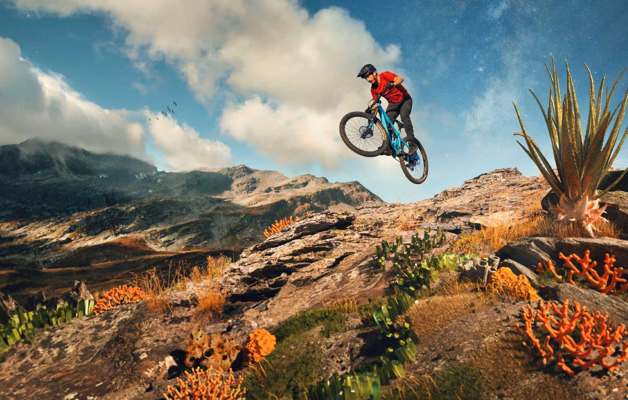 Working with 3D artist Plastic Bionic, we created three otherworldly landscapes where familiar terrain had mutated into something alien. Desert trails bloom with oversized succulent formations and crystalline cacti. Flora scales beyond reason, twisting into sculptural forms that feel both organic and impossible. The real and the surreal exist in the same frame, recognisable enough to be a ride, strange enough to be a new world entirely.
